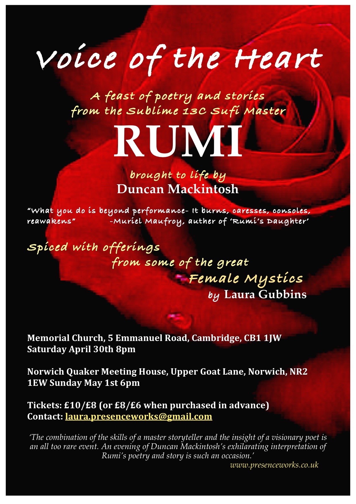 ‘The combination of the skills of a master storyteller and the insight of a visionary poet is an all too rare event. An evening of Duncan Mackintosh’s exhilarating interpretation of Rumi’s poetry and story is such an occasion.’